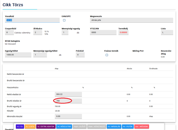 Ahhoz, hogy árat módosítsunk először az adott termék cikktörzsében kell a bruttó eladási árat átírni és az F10|Rendben gomb megnyomásával menteni.