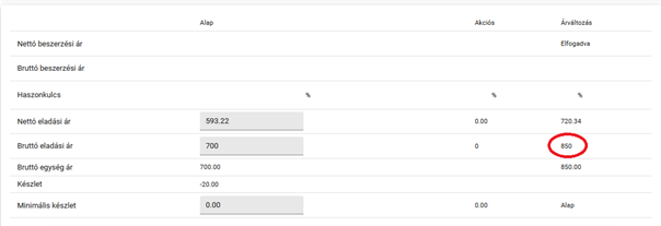 Ilyenkor a cikk Árváltozás oszlopába bekerül az új ár, azonban ekkor még nem aktiválódik az új ár, hanem csak rögzítésre kerül a rendszerbe.:
