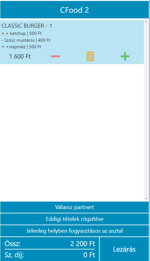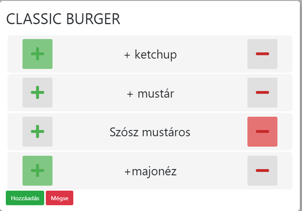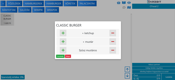 A rendszer alap beállításaiban megadható, hogy a feltét a cikk árát csak növelje vagy csökkentse is. Ha úgy van beállítva, akkor hozzáadás esetén növeli az árat, de ha az adott tételt valaki pl. hagyma nélkül kéri, akkor a termék alap ára annak ellenére ugyanaz marad.