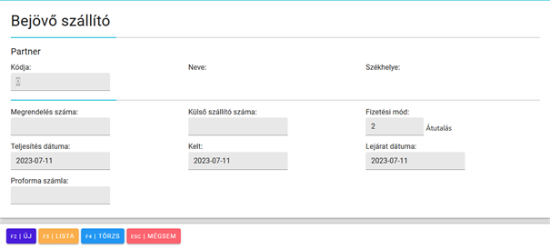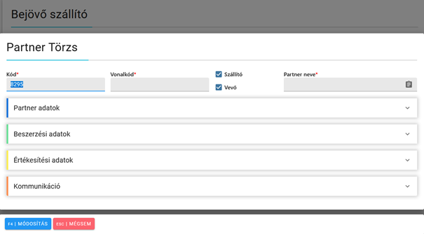 Ha még nem szerepel a beszállító a partner listában, akkor a partner kódja mezőn állva az F2/Új gomb megnyomásával jelenik meg az az ablak, amiben új partner törzset vihetünk fel.