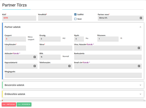 Szállító és vevő mező: azt pipáljuk be, ami igaz az adott partnerre, mind a kettőt is ki lehet pipálni. Ha valaki csak szállító, akkor a vevő mezőből szedjük ki a pipát.