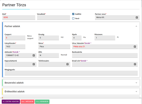 Kód: a rendszer generálja (partner azonosítására szolgál)
