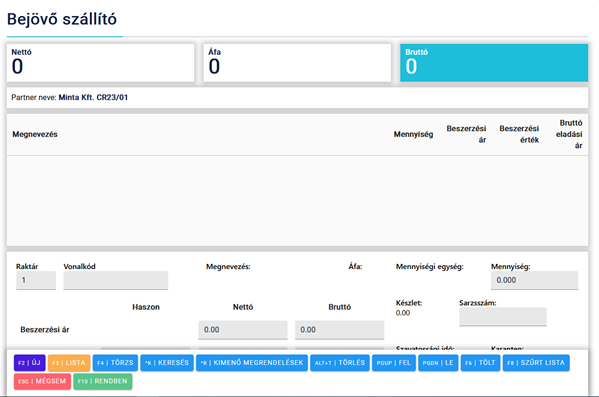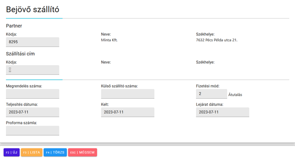 Partner kódja: Ha már felvittük a partner törzsét az adott beszállítónak, akkor az F3/Lista gomb megnyomásával jeleníthetjük meg a partner listát, amiből kiválaszthatjuk az adott beszállítót, akihez kapcsolódóan felvisszük a bejövő szállítót.
