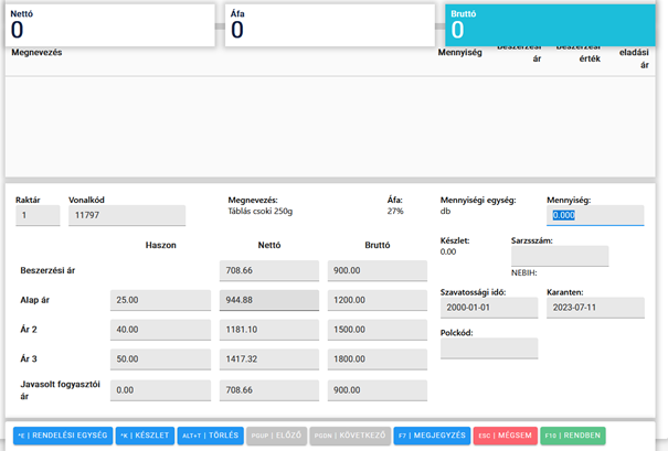 A mennyiég megadása után lehetőségünk van a beszerzési ár módosítására is, ha enter billentyűt nyomunk.