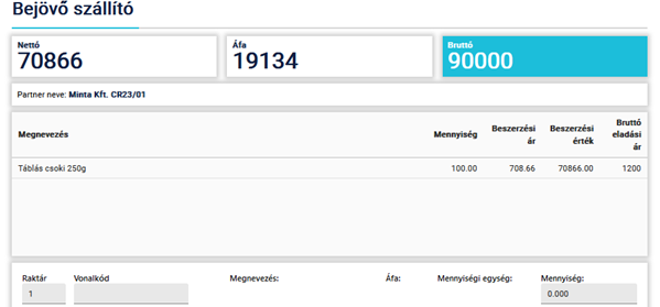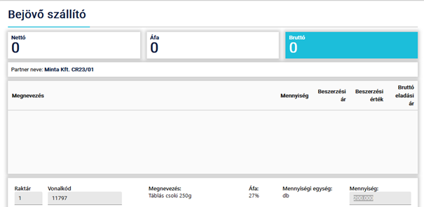 Ha pedig az adott cikknek megadtuk a mennyiségét és a beszerzési árát is, akkor az enter gomb megnyomásával adhatjuk hozzá az adott mennyiséget a cikkből a szállítóhoz.