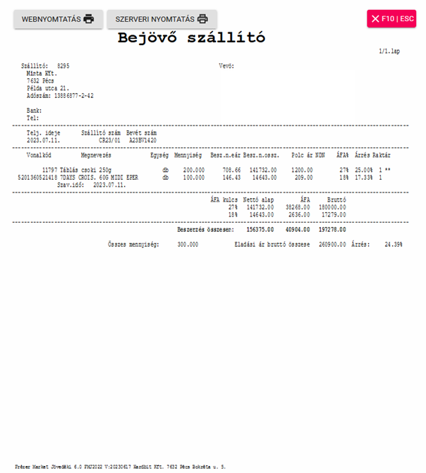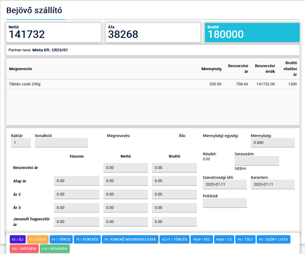 Ha lezártuk a bizonylatot, akkor elkészül a bejövő szállító és el is menthető, kinyomtatható az a nyomtató ikonokra kattintva, ha pedig csak ki szeretnénk lépni az F10/ESC gombra nyomva tehetjük azt meg.